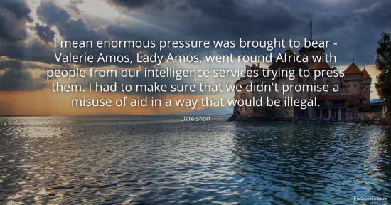 Short, Clare. (2026, January 15). I mean enormous pressure was brought to bear - Valerie Amos, Lady Amos, went round Africa with people from our intelligence services trying to press them. I had to make sure that we didn't promise a misuse of aid in a way that would be illegal. FixQuotes. https://fixquotes.com/quotes/i-mean-enormous-pressure-was-brought-to-bear--145658/