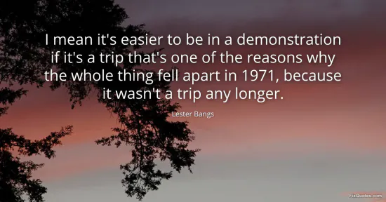 Bangs, Lester. "I mean it's easier to be in a demonstration if it's a trip that's one of the reasons why the whole thing fell apart in 1971, because it wasn't a trip any longer." FixQuotes. January 15, 2026. https://fixquotes.com/quotes/i-mean-its-easier-to-be-in-a-demonstration-if-its-150742/.