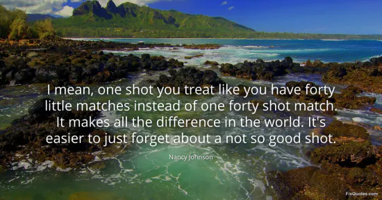 Johnson, Nancy. "I mean, one shot you treat like you have forty little matches instead of one forty shot match. It makes all the difference in the world. It's easier to just forget about a not so good shot." FixQuotes. January 16, 2026. https://fixquotes.com/quotes/i-mean-one-shot-you-treat-like-you-have-forty-136412/.