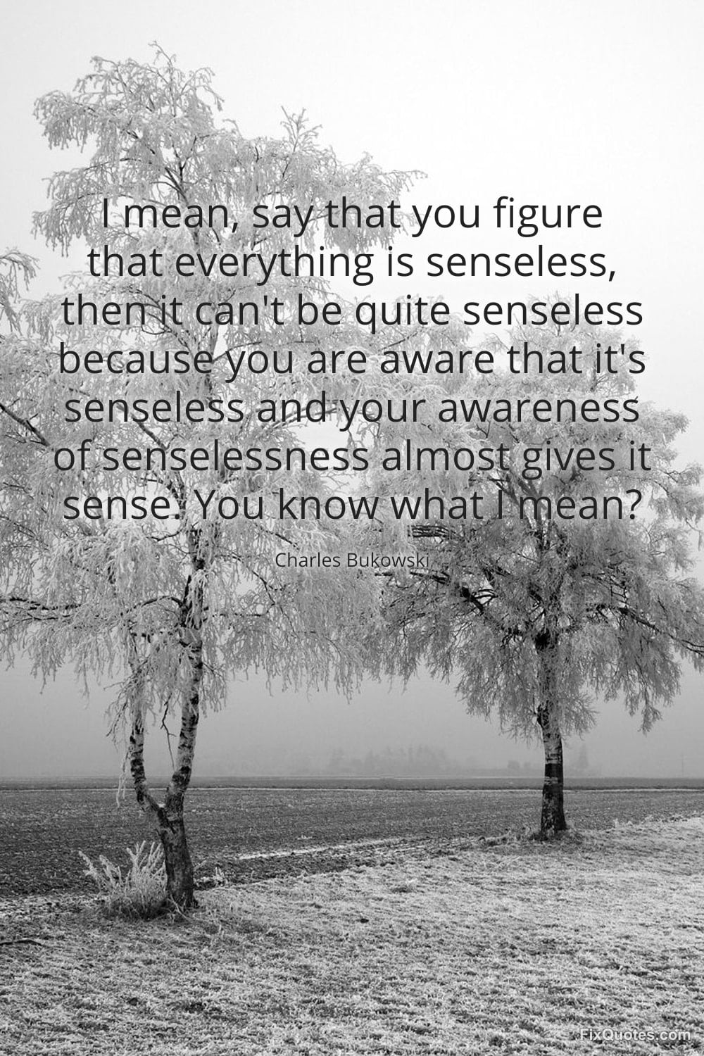 Bukowski, Charles. (2026, February 10). I mean, say that you figure that everything is senseless, then it can't be quite senseless because you are aware that it's senseless and your awareness of senselessness almost gives it sense. You know what I mean? FixQuotes. https://fixquotes.com/quotes/i-mean-say-that-you-figure-that-everything-is-185202/