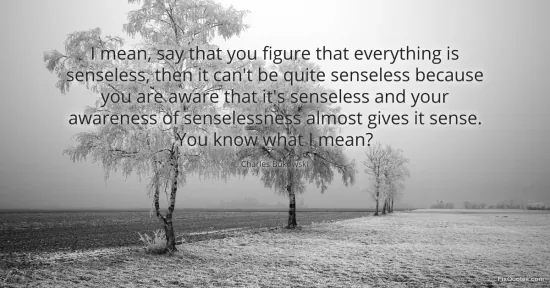 Bukowski, Charles. "I mean, say that you figure that everything is senseless, then it can't be quite senseless because you are aware that it's senseless and your awareness of senselessness almost gives it sense. You know what I mean?" FixQuotes. February 10, 2026. https://fixquotes.com/quotes/i-mean-say-that-you-figure-that-everything-is-185202/.