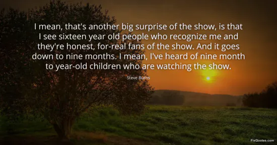 Burns, Steve. "I mean, that's another big surprise of the show, is that I see sixteen year old people who recognize me and they're honest, for-real fans of the show. And it goes down to nine months. I mean, I've heard of nine month to year-old children who are watching the show." FixQuotes. January 15, 2026. https://fixquotes.com/quotes/i-mean-thats-another-big-surprise-of-the-show-is-159721/.