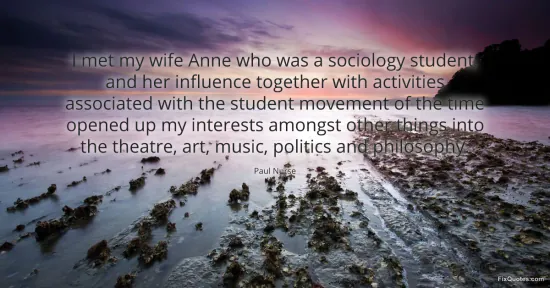 Nurse, Paul. "I met my wife Anne who was a sociology student, and her influence together with activities associated with the student movement of the time opened up my interests amongst other things into the theatre, art, music, politics and philosophy." FixQuotes. January 16, 2026. https://fixquotes.com/quotes/i-met-my-wife-anne-who-was-a-sociology-student-128533/.