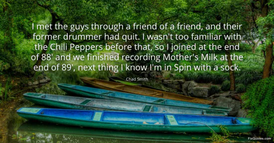 Smith, Chad. (2026, January 17). I met the guys through a friend of a friend, and their former drummer had quit. I wasn't too familiar with the Chili Peppers before that, so I joined at the end of 88' and we finished recording Mother's Milk at the end of 89', next thing I know I'm in Spin with a sock. FixQuotes. https://fixquotes.com/quotes/i-met-the-guys-through-a-friend-of-a-friend-and-39448/