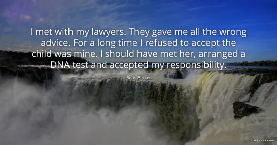 Becker, Boris. "I met with my lawyers. They gave me all the wrong advice. For a long time I refused to accept the child was mine. I should have met her, arranged a DNA test and accepted my responsibility." FixQuotes. January 15, 2026. https://fixquotes.com/quotes/i-met-with-my-lawyers-they-gave-me-all-the-wrong-148356/.