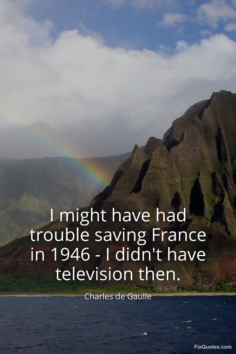 Gaulle, Charles de. (2026, January 15). I might have had trouble saving France in 1946 - I didn't have television then. FixQuotes. https://fixquotes.com/quotes/i-might-have-had-trouble-saving-france-in-1946-44851/