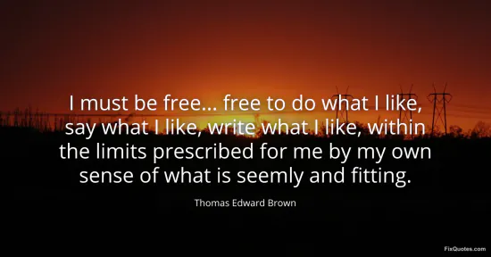 Brown, Thomas Edward. "I must be free... free to do what I like, say what I like, write what I like, within the limits prescribed for me by my own sense of what is seemly and fitting." FixQuotes. January 17, 2026. https://fixquotes.com/quotes/i-must-be-free-free-to-do-what-i-like-say-what-i-65948/.
