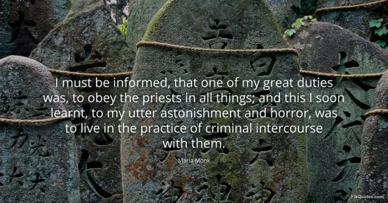 Monk, Maria. (2026, January 15). I must be informed, that one of my great duties was, to obey the priests in all things; and this I soon learnt, to my utter astonishment and horror, was to live in the practice of criminal intercourse with them. FixQuotes. https://fixquotes.com/quotes/i-must-be-informed-that-one-of-my-great-duties-76039/