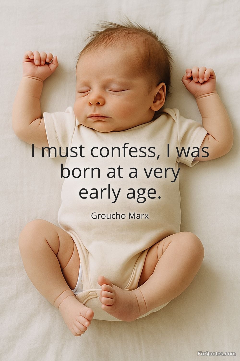 Marx, Groucho. "I must confess, I was born at a very early age." FixQuotes. January 11, 2026. https://fixquotes.com/quotes/i-must-confess-i-was-born-at-a-very-early-age-7424/.
