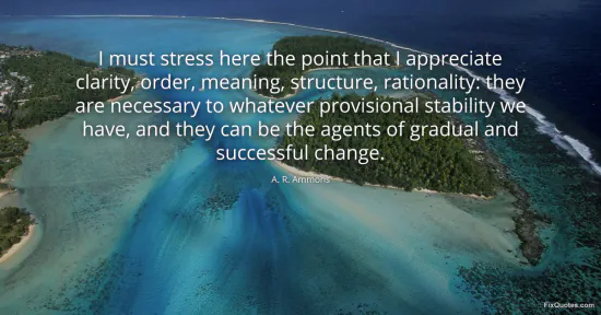 Ammons, A. R. (2026, January 17). I must stress here the point that I appreciate clarity, order, meaning, structure, rationality: they are necessary to whatever provisional stability we have, and they can be the agents of gradual and successful change. FixQuotes. https://fixquotes.com/quotes/i-must-stress-here-the-point-that-i-appreciate-40248/