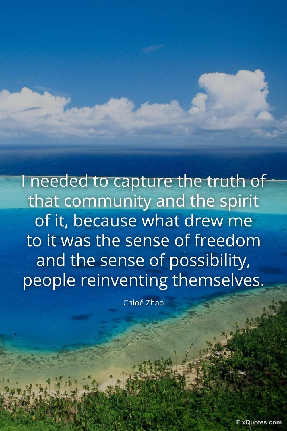 Zhao, Chloé. "I needed to capture the truth of that community and the spirit of it, because what drew me to it was the sense of freedom and the sense of possibility, people reinventing themselves." FixQuotes. January 25, 2026. https://fixquotes.com/quotes/i-needed-to-capture-the-truth-of-that-community-184247/.