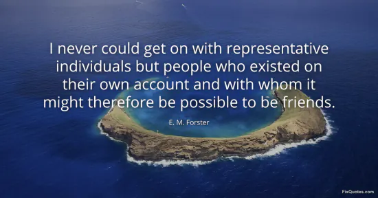 Forster, E. M. (2026, January 18). I never could get on with representative individuals but people who existed on their own account and with whom it might therefore be possible to be friends. FixQuotes. https://fixquotes.com/quotes/i-never-could-get-on-with-representative-11403/