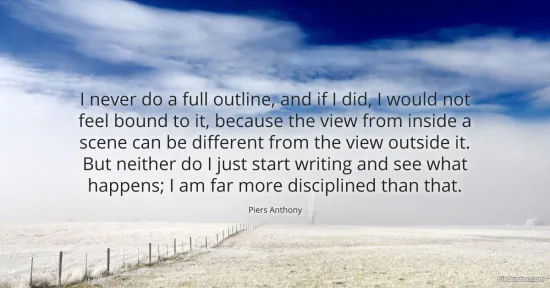 Anthony, Piers. "I never do a full outline, and if I did, I would not feel bound to it, because the view from inside a scene can be different from the view outside it. But neither do I just start writing and see what happens; I am far more disciplined than that." FixQuotes. January 15, 2026. https://fixquotes.com/quotes/i-never-do-a-full-outline-and-if-i-did-i-would-144859/.