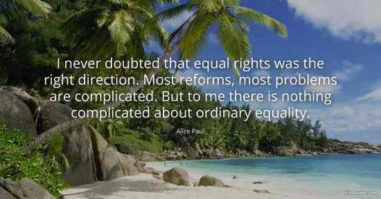Paul, Alice. "I never doubted that equal rights was the right direction. Most reforms, most problems are complicated. But to me there is nothing complicated about ordinary equality." FixQuotes. January 15, 2026. https://fixquotes.com/quotes/i-never-doubted-that-equal-rights-was-the-right-46050/.