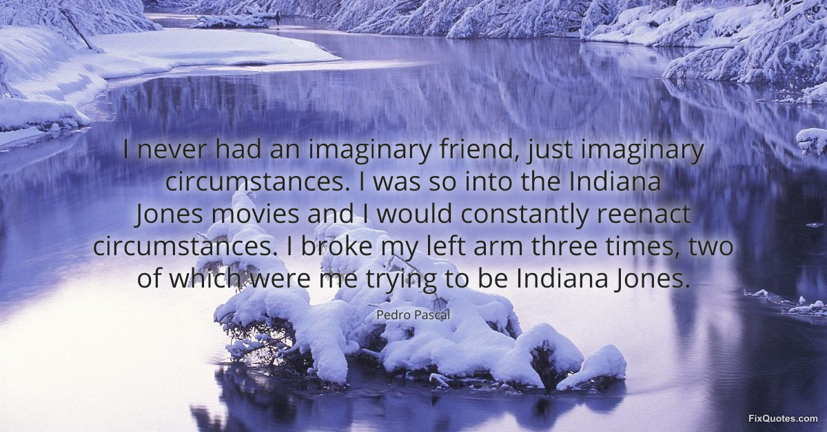 Pascal, Pedro. (2026, February 9). I never had an imaginary friend, just imaginary circumstances. I was so into the Indiana Jones movies and I would constantly reenact circumstances. I broke my left arm three times, two of which were me trying to be Indiana Jones. FixQuotes. https://fixquotes.com/quotes/i-never-had-an-imaginary-friend-just-imaginary-184984/