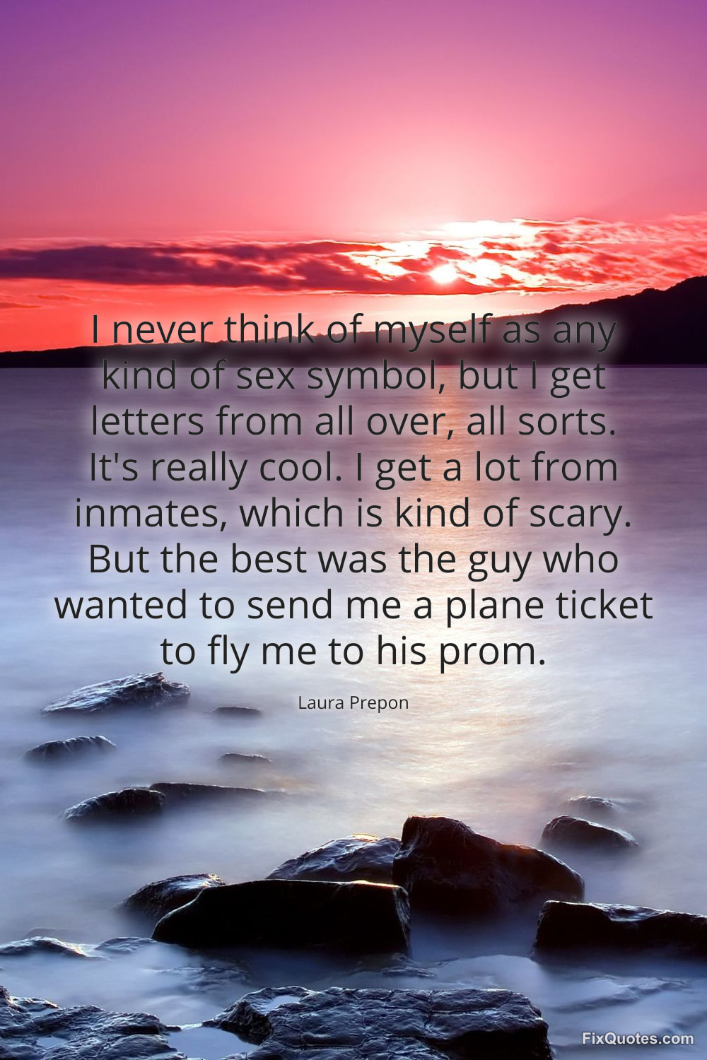 Prepon, Laura. "I never think of myself as any kind of sex symbol, but I get letters from all over, all sorts. It's really cool. I get a lot from inmates, which is kind of scary. But the best was the guy who wanted to send me a plane ticket to fly me to his prom." FixQuotes. January 15, 2026. https://fixquotes.com/quotes/i-never-think-of-myself-as-any-kind-of-sex-symbol-146734/.