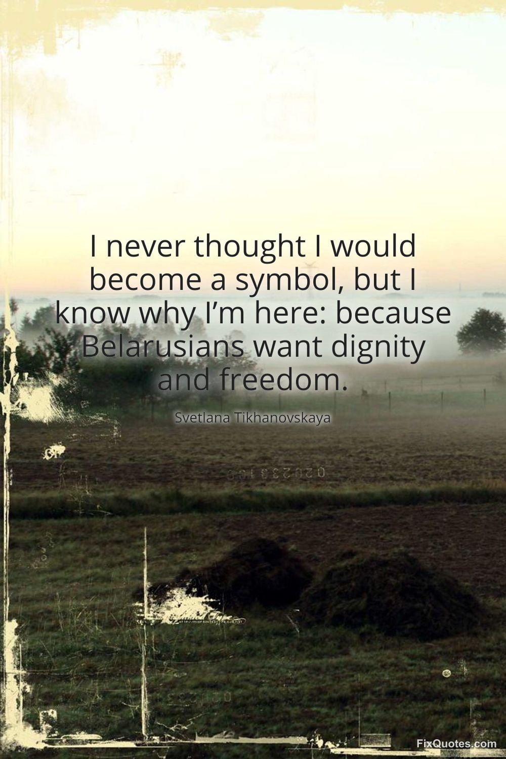 Tikhanovskaya, Svetlana. (2026, January 26). I never thought I would become a symbol, but I know why I’m here: because Belarusians want dignity and freedom. FixQuotes. https://fixquotes.com/quotes/i-never-thought-i-would-become-a-symbol-but-i-184596/