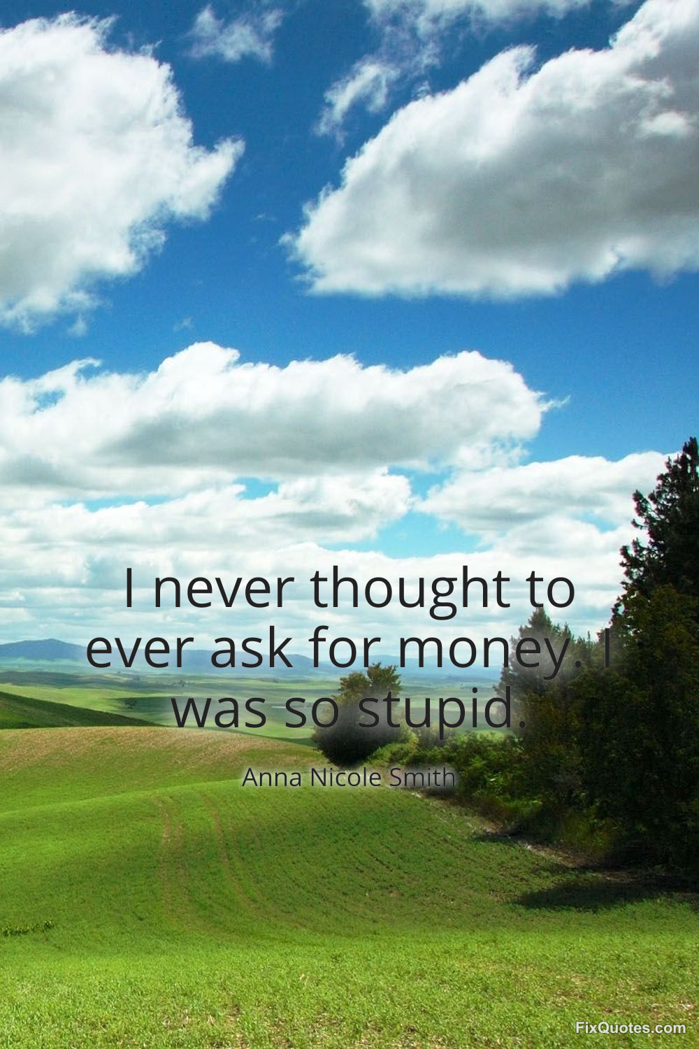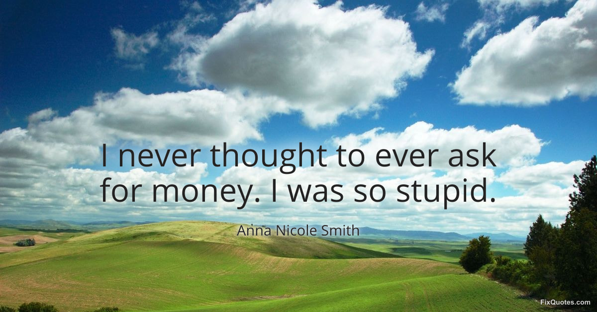 Smith, Anna Nicole. (2026, January 17). I never thought to ever ask for money. I was so stupid. FixQuotes. https://fixquotes.com/quotes/i-never-thought-to-ever-ask-for-money-i-was-so-62855/