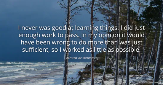 A war hero admitting he was a minimal-effort student lands like a thrown wrench in the myth of genius-as-grind. Richthofen isn’t confessing laziness so much as announcing a code: efficiency over earnestness, outcomes over approval. The kicker is the moral turn - “it would have been wrong” to do more than sufficient. He reframes slacking as integrity, implying that institutions often reward performative diligence rather than useful competence. It’s a young aristocrat’s contempt for busywork, dressed up as principle.
