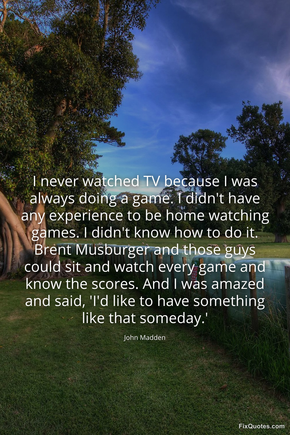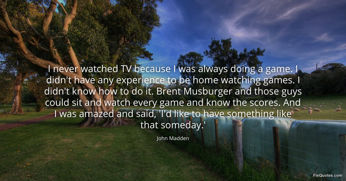 Madden, John. (2026, January 15). I never watched TV because I was always doing a game. I didn't have any experience to be home watching games. I didn't know how to do it. Brent Musburger and those guys could sit and watch every game and know the scores. And I was amazed and said, 'I'd like to have something like that someday.'. FixQuotes. https://fixquotes.com/quotes/i-never-watched-tv-because-i-was-always-doing-a-173581/