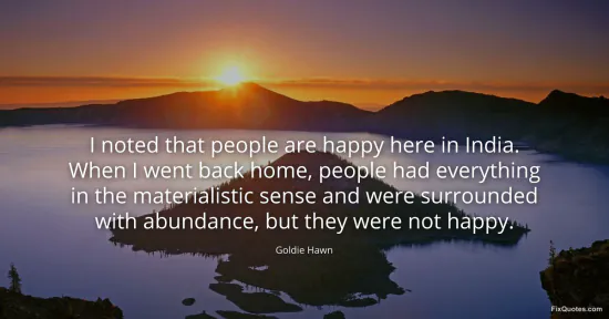 Hawn, Goldie. (2026, January 17). I noted that people are happy here in India. When I went back home, people had everything in the materialistic sense and were surrounded with abundance, but they were not happy. FixQuotes. https://fixquotes.com/quotes/i-noted-that-people-are-happy-here-in-india-when-72346/