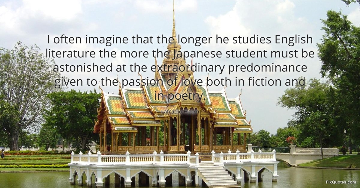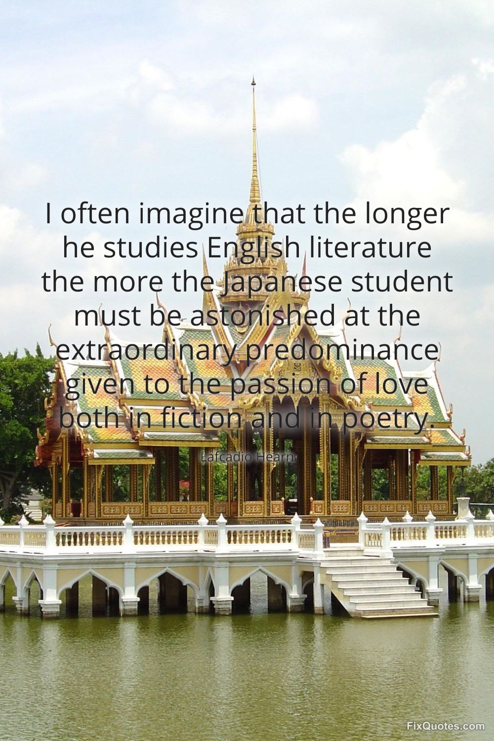 Hearn, Lafcadio. (2026, January 17). I often imagine that the longer he studies English literature the more the Japanese student must be astonished at the extraordinary predominance given to the passion of love both in fiction and in poetry. FixQuotes. https://fixquotes.com/quotes/i-often-imagine-that-the-longer-he-studies-70712/