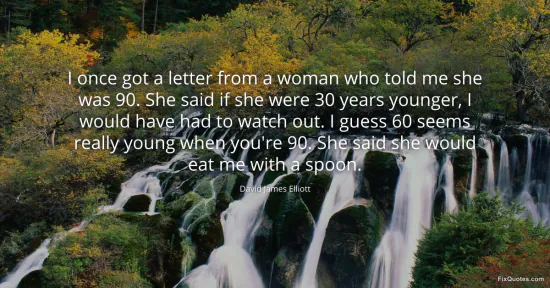 Elliott, David James. (2026, January 15). I once got a letter from a woman who told me she was 90. She said if she were 30 years younger, I would have had to watch out. I guess 60 seems really young when you're 90. She said she would eat me with a spoon. FixQuotes. https://fixquotes.com/quotes/i-once-got-a-letter-from-a-woman-who-told-me-she-158092/
