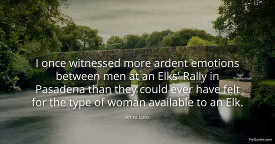 Loos, Anita. (2026, January 17). I once witnessed more ardent emotions between men at an Elks' Rally in Pasadena than they could ever have felt for the type of woman available to an Elk. FixQuotes. https://fixquotes.com/quotes/i-once-witnessed-more-ardent-emotions-between-men-35927/