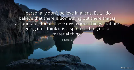 Walsh, J. T. (2026, January 16). I personally don't believe in aliens. But, I do believe that there is something out there that is accountable for all these mysterious things that are going on: I think it is a spiritual thing not a material thing. FixQuotes. https://fixquotes.com/quotes/i-personally-dont-believe-in-aliens-but-i-do-106392/