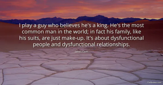 Caan, James. (2026, January 15). I play a guy who believes he's a king. He's the most common man in the world; in fact his family, like his suits, are just make-up. It's about dysfunctional people and dysfunctional relationships. FixQuotes. https://fixquotes.com/quotes/i-play-a-guy-who-believes-hes-a-king-hes-the-most-149207/