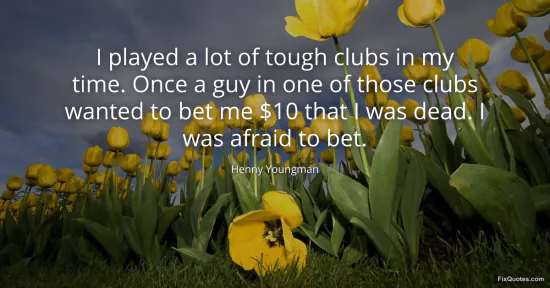 Youngman, Henny. "I played a lot of tough clubs in my time. Once a guy in one of those clubs wanted to bet me $10 that I was dead. I was afraid to bet." FixQuotes. January 18, 2026. https://fixquotes.com/quotes/i-played-a-lot-of-tough-clubs-in-my-time-once-a-14622/.