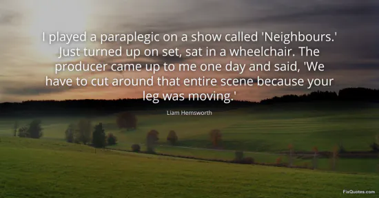 Hemsworth, Liam. "I played a paraplegic on a show called 'Neighbours.' Just turned up on set, sat in a wheelchair. The producer came up to me one day and said, 'We have to cut around that entire scene because your leg was moving.'." FixQuotes. January 15, 2026. https://fixquotes.com/quotes/i-played-a-paraplegic-on-a-show-called-neighbours-172453/.
