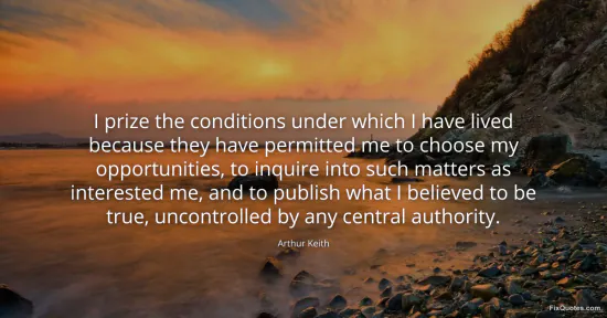 Keith, Arthur. "I prize the conditions under which I have lived because they have permitted me to choose my opportunities, to inquire into such matters as interested me, and to publish what I believed to be true, uncontrolled by any central authority." FixQuotes. January 15, 2026. https://fixquotes.com/quotes/i-prize-the-conditions-under-which-i-have-lived-139739/.
