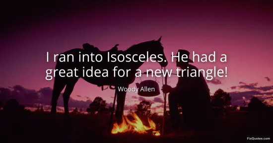 Woody Allen turns a geometry pun into a little theater of ego, which is basically his home turf. “I ran into Isosceles” treats a math term like an old acquaintance on the street, instantly humanizing the abstract and setting up the classic Allen move: intellectual material repackaged as social awkwardness. The laugh hinges on the double meaning of “great idea” and “new triangle.” In math, there are only so many triangle types; the notion that Isosceles is pitching a “new” one is absurd, like watching a mid-level creative in a meeting insist they’ve reinvented the wheel. That’s the joke, but it’s also the subtext: a jab at novelty culture and the desperate, often ridiculous pressure to produce “new ideas” in fields where the rules are already set.