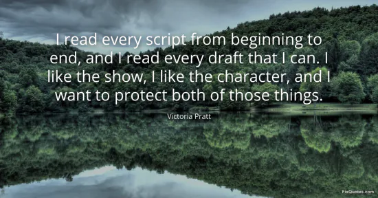 Pratt, Victoria. "I read every script from beginning to end, and I read every draft that I can. I like the show, I like the character, and I want to protect both of those things." FixQuotes. January 16, 2026. https://fixquotes.com/quotes/i-read-every-script-from-beginning-to-end-and-i-104338/.