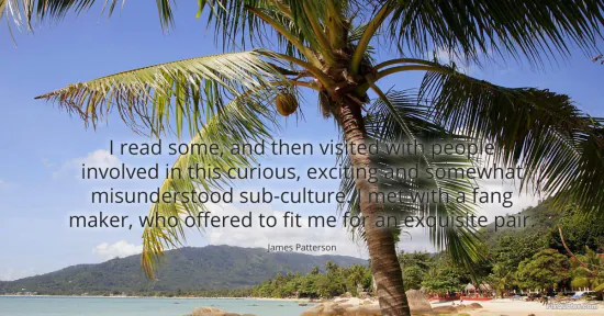 Patterson, James. "I read some, and then visited with people involved in this curious, exciting and somewhat misunderstood sub-culture. I met with a fang maker, who offered to fit me for an exquisite pair." FixQuotes. January 16, 2026. https://fixquotes.com/quotes/i-read-some-and-then-visited-with-people-involved-86037/.