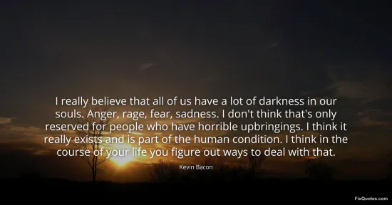 Bacon, Kevin. "I really believe that all of us have a lot of darkness in our souls. Anger, rage, fear, sadness. I don't think that's only reserved for people who have horrible upbringings. I think it really exists and is part of the human condition. I think in the course of your life you figure out ways to deal with that." FixQuotes. January 17, 2026. https://fixquotes.com/quotes/i-really-believe-that-all-of-us-have-a-lot-of-70460/.