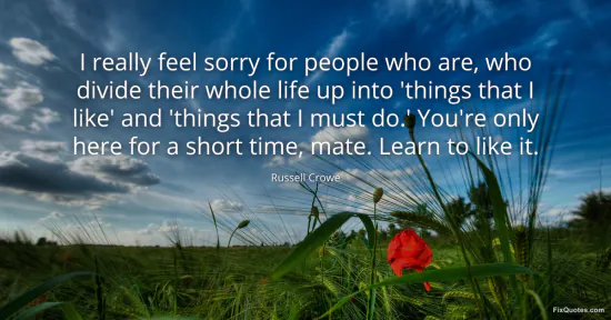 Crowe, Russell. (2026, January 17). I really feel sorry for people who are, who divide their whole life up into 'things that I like' and 'things that I must do.' You're only here for a short time, mate. Learn to like it. FixQuotes. https://fixquotes.com/quotes/i-really-feel-sorry-for-people-who-are-who-divide-73596/