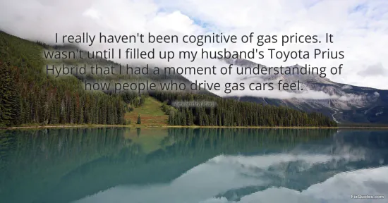 "I really haven't been cognitive of gas prices. It wasn't until I filled up my husband's Toyota Prius Hybrid that I had a moment of understanding of how people who drive gas cars feel." FixQuotes, 15 Jan. 2026, https://fixquotes.com/quotes/i-really-havent-been-cognitive-of-gas-prices-it-157670/. Accessed 22 Feb. 2026.