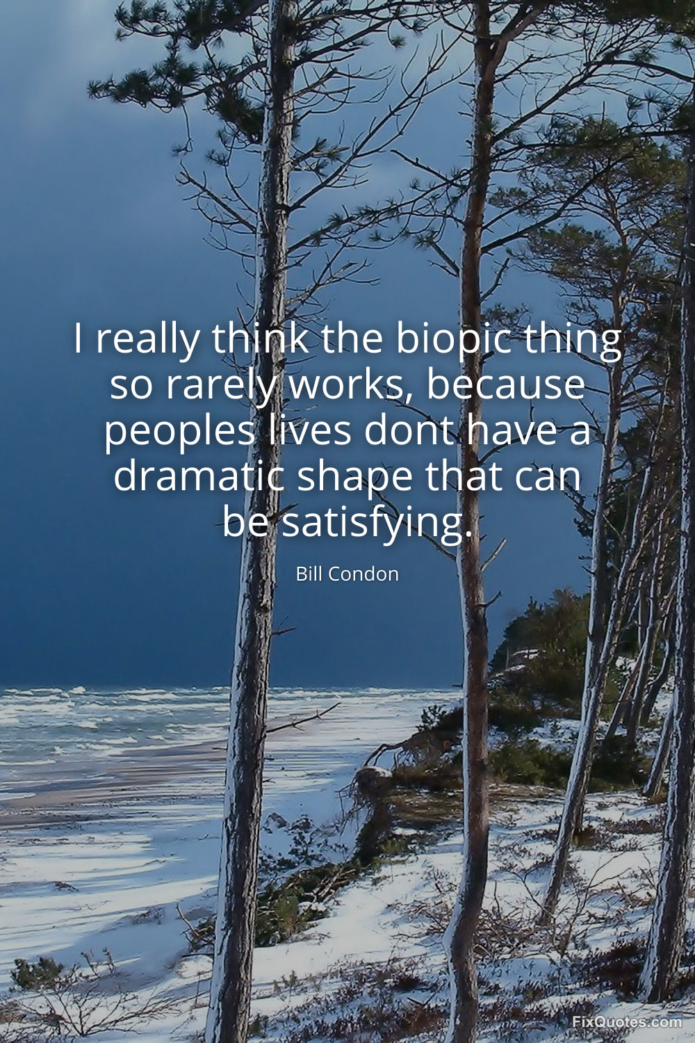 Condon, Bill. (2026, January 22). I really think the biopic thing so rarely works, because peoples lives dont have a dramatic shape that can be satisfying. FixQuotes. https://fixquotes.com/quotes/i-really-think-the-biopic-thing-so-rarely-works-184067/