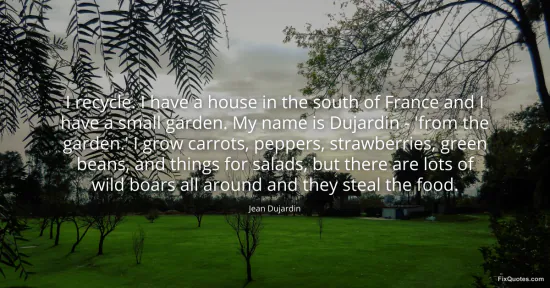 Dujardin, Jean. (2026, January 18). I recycle. I have a house in the south of France and I have a small garden. My name is Dujardin - 'from the garden.' I grow carrots, peppers, strawberries, green beans, and things for salads, but there are lots of wild boars all around and they steal the food. FixQuotes. https://fixquotes.com/quotes/i-recycle-i-have-a-house-in-the-south-of-france-21793/