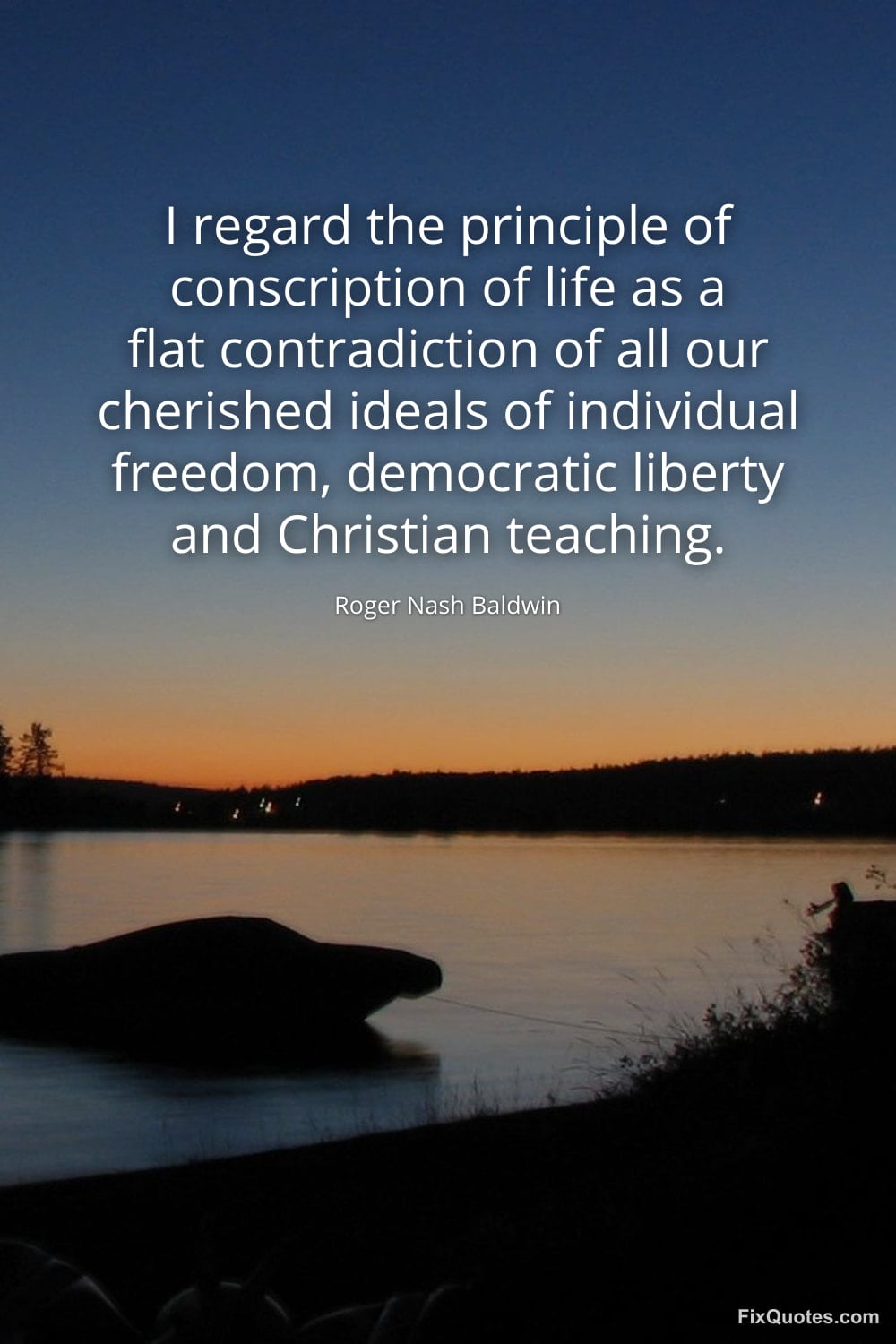Baldwin, Roger Nash. (2026, January 15). I regard the principle of conscription of life as a flat contradiction of all our cherished ideals of individual freedom, democratic liberty and Christian teaching. FixQuotes. https://fixquotes.com/quotes/i-regard-the-principle-of-conscription-of-life-as-160857/