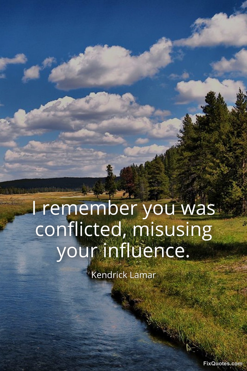 Lamar, Kendrick. "I remember you was conflicted, misusing your influence." FixQuotes. February 1, 2026. https://fixquotes.com/quotes/i-remember-you-was-conflicted-misusing-your-184842/.