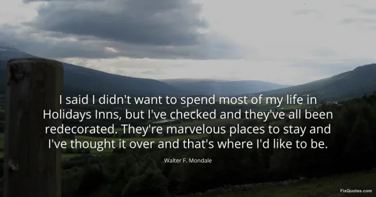 Mondale, Walter F. "I said I didn't want to spend most of my life in Holidays Inns, but I've checked and they've all been redecorated. They're marvelous places to stay and I've thought it over and that's where I'd like to be." FixQuotes. January 15, 2026. https://fixquotes.com/quotes/i-said-i-didnt-want-to-spend-most-of-my-life-in-166411/.