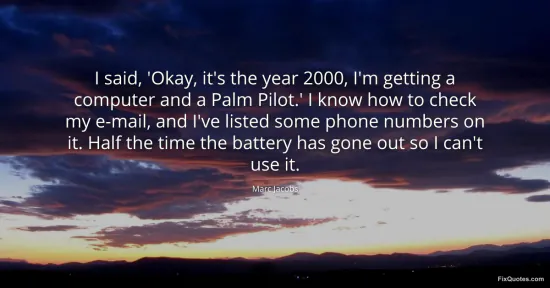 Jacobs, Marc. (2026, January 15). I said, 'Okay, it's the year 2000, I'm getting a computer and a Palm Pilot.' I know how to check my e-mail, and I've listed some phone numbers on it. Half the time the battery has gone out so I can't use it. FixQuotes. https://fixquotes.com/quotes/i-said-okay-its-the-year-2000-im-getting-a-23189/