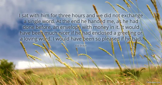 Braun, Eva. "I sat with him for three hours and we did not exchange a single word. At the end he handed me, as he had done before, an envelope with money in it. It would have been much nicer if he had enclosed a greeting or a loving word. I would have been so pleased if he had." FixQuotes. January 15, 2026. https://fixquotes.com/quotes/i-sat-with-him-for-three-hours-and-we-did-not-158209/.