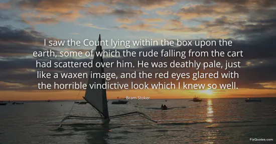 "I saw the Count lying within the box upon the earth, some of which the rude falling from the cart had scattered over him. He was deathly pale, just like a waxen image, and the red eyes glared with the horrible vindictive look which I knew so well." FixQuotes, 16 Jan. 2026, https://fixquotes.com/quotes/i-saw-the-count-lying-within-the-box-upon-the-139345/. Accessed 12 Feb. 2026.