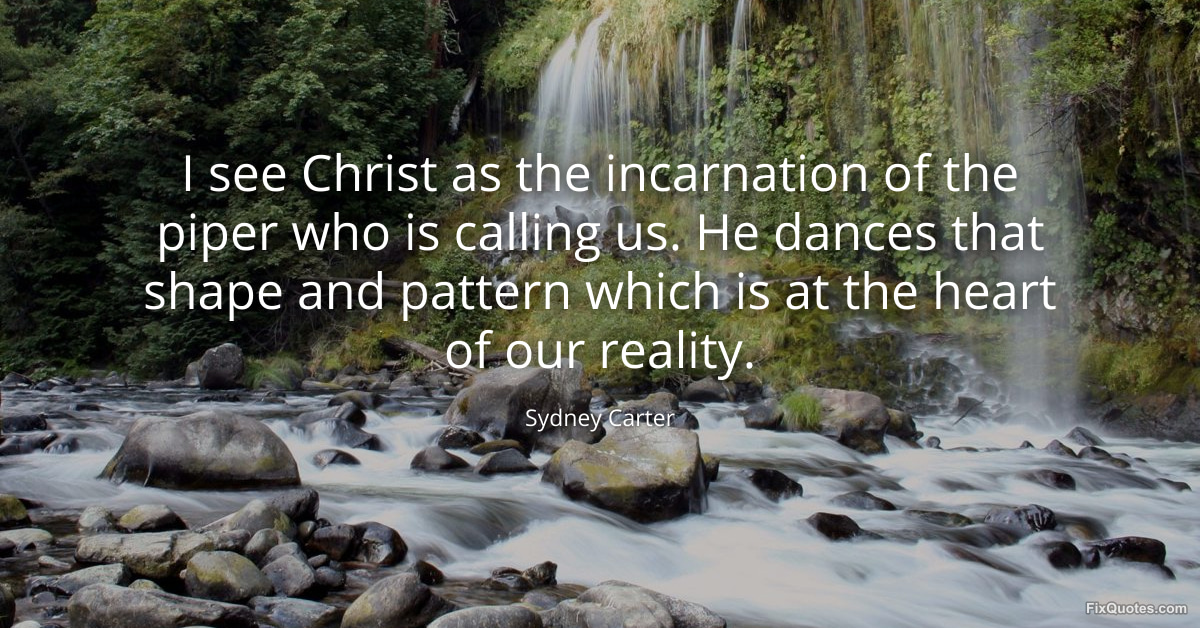 Carter, Sydney. "I see Christ as the incarnation of the piper who is calling us. He dances that shape and pattern which is at the heart of our reality." FixQuotes. January 16, 2026. https://fixquotes.com/quotes/i-see-christ-as-the-incarnation-of-the-piper-who-119238/.