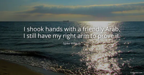 Milligan, Spike. "I shook hands with a friendly Arab. I still have my right arm to prove it." FixQuotes. January 18, 2026. https://fixquotes.com/quotes/i-shook-hands-with-a-friendly-arab-i-still-have-1821/.