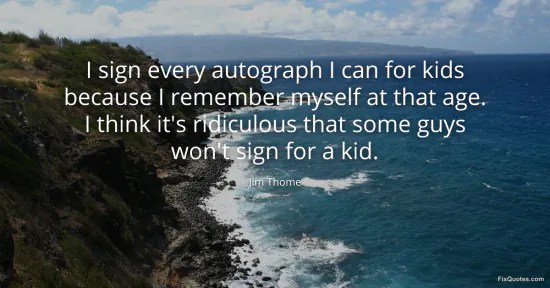 Thome, Jim. "I sign every autograph I can for kids because I remember myself at that age. I think it's ridiculous that some guys won't sign for a kid." FixQuotes. January 16, 2026. https://fixquotes.com/quotes/i-sign-every-autograph-i-can-for-kids-because-i-135643/.
